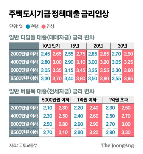 - 일반 버팀목 대출 : 인상 전 2.5%~3.5%에서 인상 후 2.7%~3.7%로 조정
