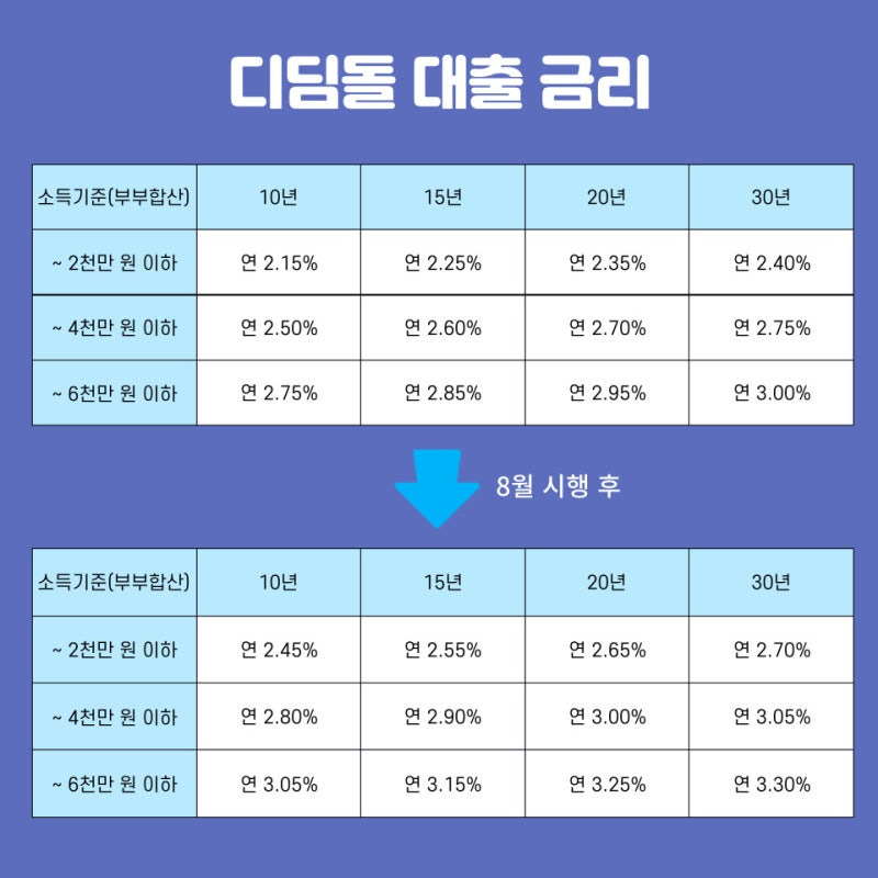 - 일반 디딤돌 대출 : 인상 전 1.6%~4.3%에서 인상 후 1.8%~4.5%로 조정